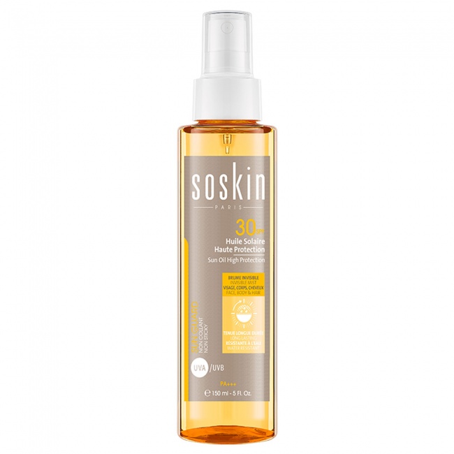 Αδιάβροχο αντηλιακό λάδι Soskin Huile Solaire υψηλής προστασίας SPF30 για πρόσωπο, σώμα και μαλλιά.