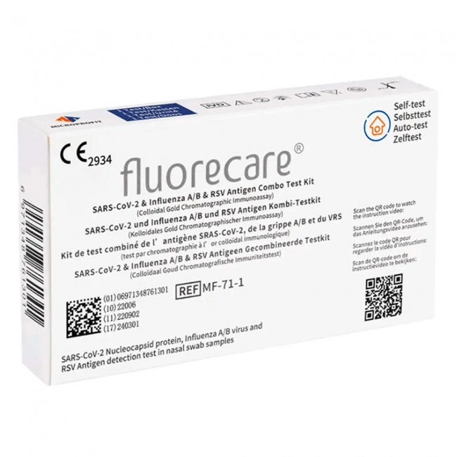 Fluorecare Covid-19 & Influenza A/B & RSV Antigen Combo Test Kit Αυτοδιαγνωστικό Ρινικό Τεστ Ταχείας Δοκιμής για Ποιοτική Ανίχνευση Αντιγόνων Covid-19 & Γρίπης Τύπου Α/Β & του Αναπνευστικού Συγκυτιακού Ιού RSV 1 Τεμάχιο