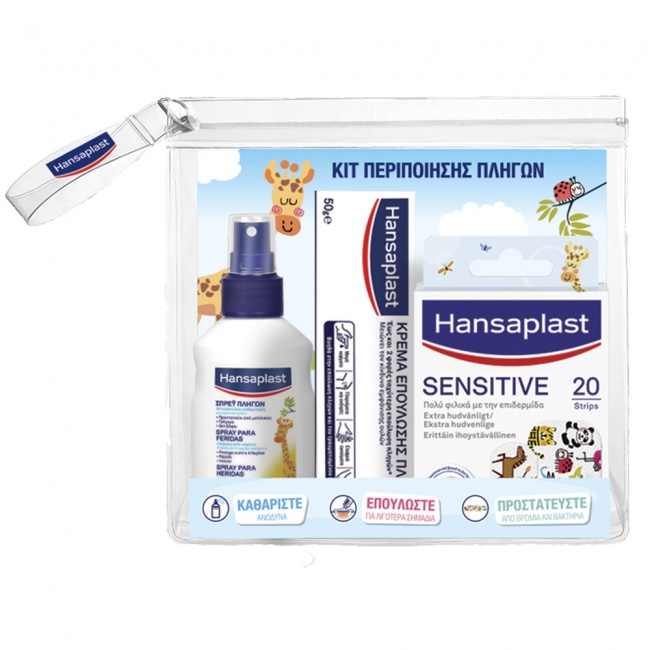 Το Hansaplast Κιτ Περιποίησης Πληγών για Παιδιά περιλαμβάνει καθαριστικό σπρέι, επιθέματα με παιδικά σχέδια και επουλωτική κρέμα που επιταχύνει τη φυσική επούλωση.