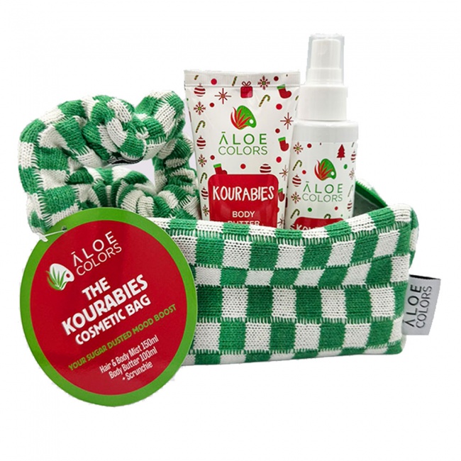 Το γιορτινό σετ Aloe+ Colors The Kourabies Cosmetic Bag περιλαμβάνει Hair & Body Mist 150ml, Body Butter 100ml και Scrunchie, με warm buttery άρωμα "κουραμπιέ" και πλούσια ενυδάτωση σε πρακτικό νεσεσέρ.