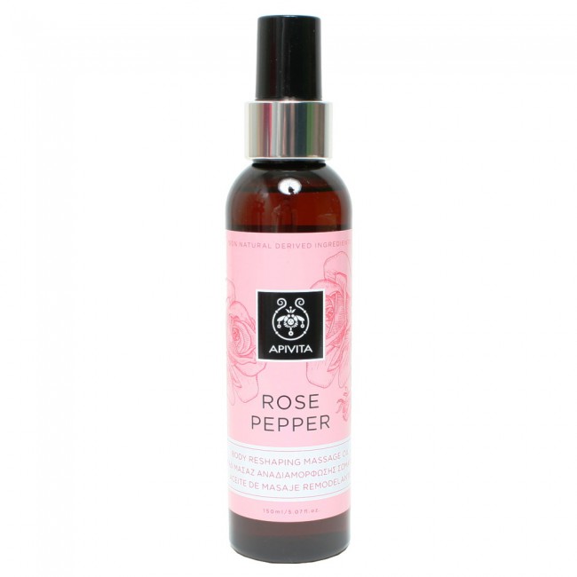 Το Apivita Rose Pepper λάδι μασάζ αναδιαμόρφωσης σώματος περιέχει ροζ πιπέρι.