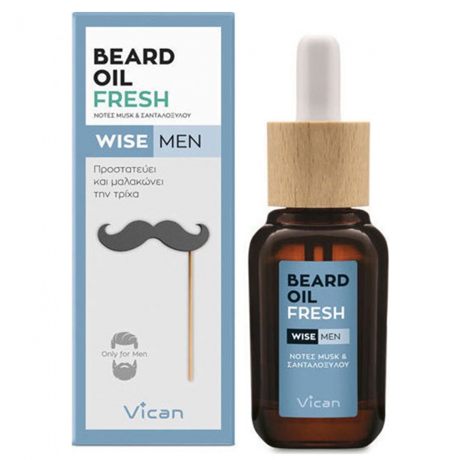 Το beard oil της wise men από τη VICAN μαλακώνει και δίνει λάμψη στο μούσι του άντρα χωρίς να λαδώνει.