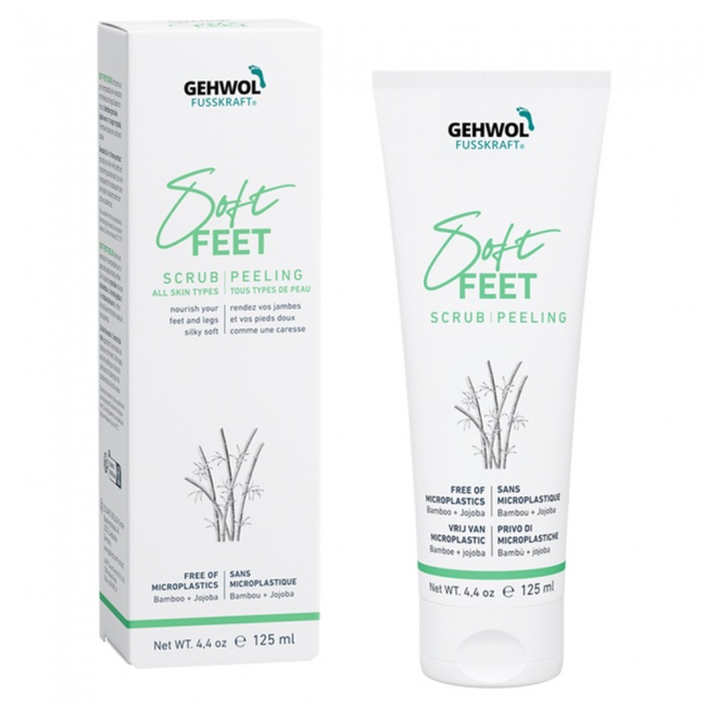 Η νέα βελτιωμένη απολεπιστική κρέμα GEHWOL FUSSKRAFT Soft Feet Scrub 125ml με κόκκους μπαμπού και κερί τζοτζόμπα, σας προσφέρει όμορφα και περιποιημένα πέλματα και γάμπες
