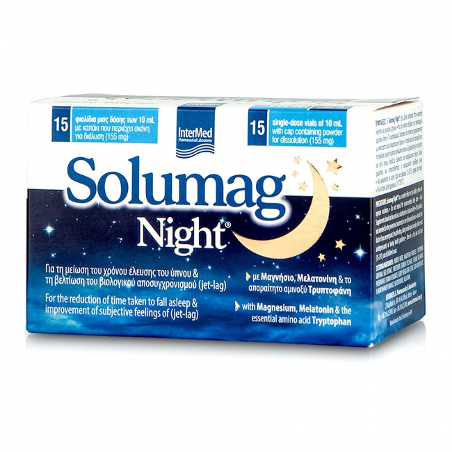 Το Solumag Night χάρη στον μοναδικό συνδυασμό μαγνησίου και μελατονίνης, βοηθά ώστε να μειωθεί ο χρόνος έλευσης του ύπνου, συμβάλλοντας στη φυσιολογική λειτουργία του νευρικού συστήματος και μειώνοντας παράλληλα την κόπωση.
