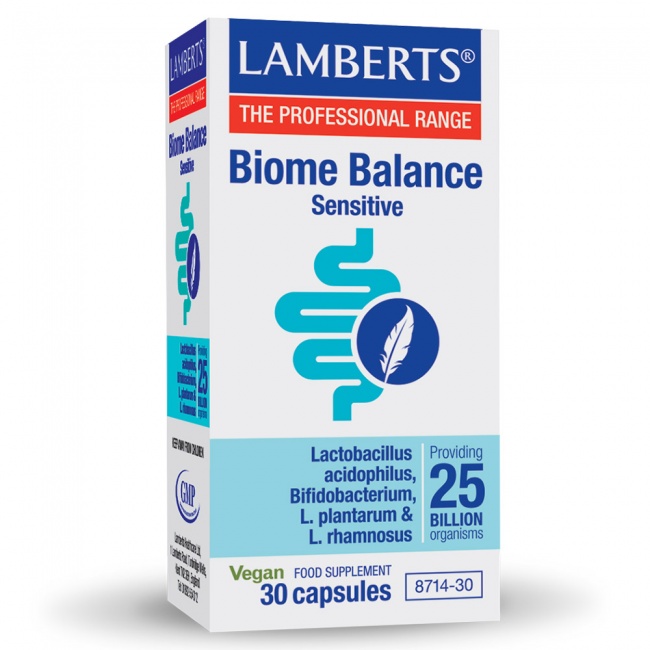 Το Lamberts Biome Balance Sensitive συνδυάζει 4 μελετημένα στελέχη φιλικών βακτηρίων (L. rhamnosus, L. acidophilus, L. plantarum, B. bifidum) σε 25 δισ. ανά κάψουλα, χωρίς γάλα και κατάλληλο για vegans.